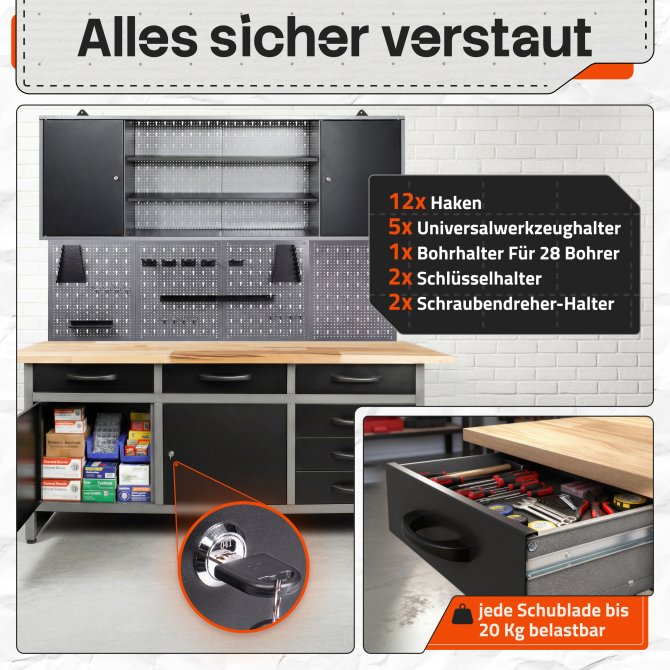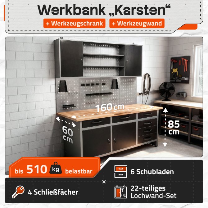Werkstatteinrichtung 160 cm - Arbeitshöhe 85 cm - bestehend aus 1 x Werkbank (Karsten), 1 x Werkstattschrank (160 cm), 4 x Lochwand, 1 x Lochwandhaken-Set