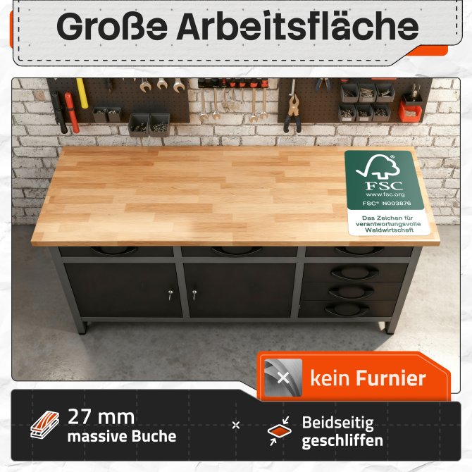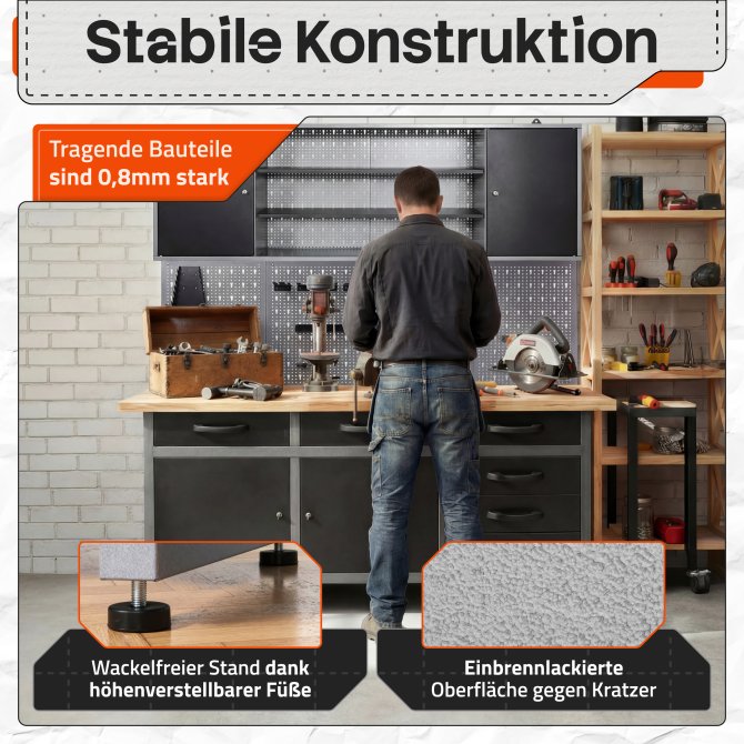 Die Werkbank Karsten verfügt über sechs Schubladen (ca. 43 x 43 x 13 (H) cm) sowie über zwei Schrankteile (je ca. 46 x 47 x 42 (H) cm) und bietet insgesamt ausreichen Stauraum für Werkzeuge und Kleinteile. Beide Schrankteile sind verschließbar. Die Schubladen lassen sich ganz einfach mit den kugelgelagerten Führungsschienen schieben. Die Maße der Werkbank Karsten betragen ca. 160 x 60 x 85 (H) cm. Außerdem überzeugt die Werkbank mit einer stabilen 160 cm langen Holzplatte, welche eine Stärke von 28 mm aufweist und ist aus hochwertigem Buchenholz verleimt ist - dadurch ist sie top-solide! Mithilfe des verschließbaren Schrankteils lässt sich auch großes Werkzeug sicher und einfach verstauen. Höhenverstellbare Füße sorgen für einen stabilen Stand sowie für ein bequemes Arbeiten auf der Werkbank Karsten. Der Metallkorpus ist neben einem modernen Design auch durch seine Resistenz gegen Kratzern und Feuchtigkeit charakterisiert.