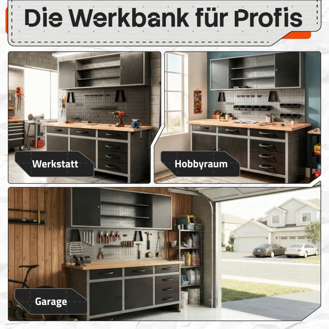 Sie können die verschiedenen Einzelteile der Werkstatteinrichtung auch getrennt voneinander positionieren, um Ihre Werkstatt ganz individuell nach Ihren Wünschen zu gestalten. Weiterhin ist die Werkstatteinrichtung mit unseren anderen Werkstattartikeln problemlos erweiterbar!