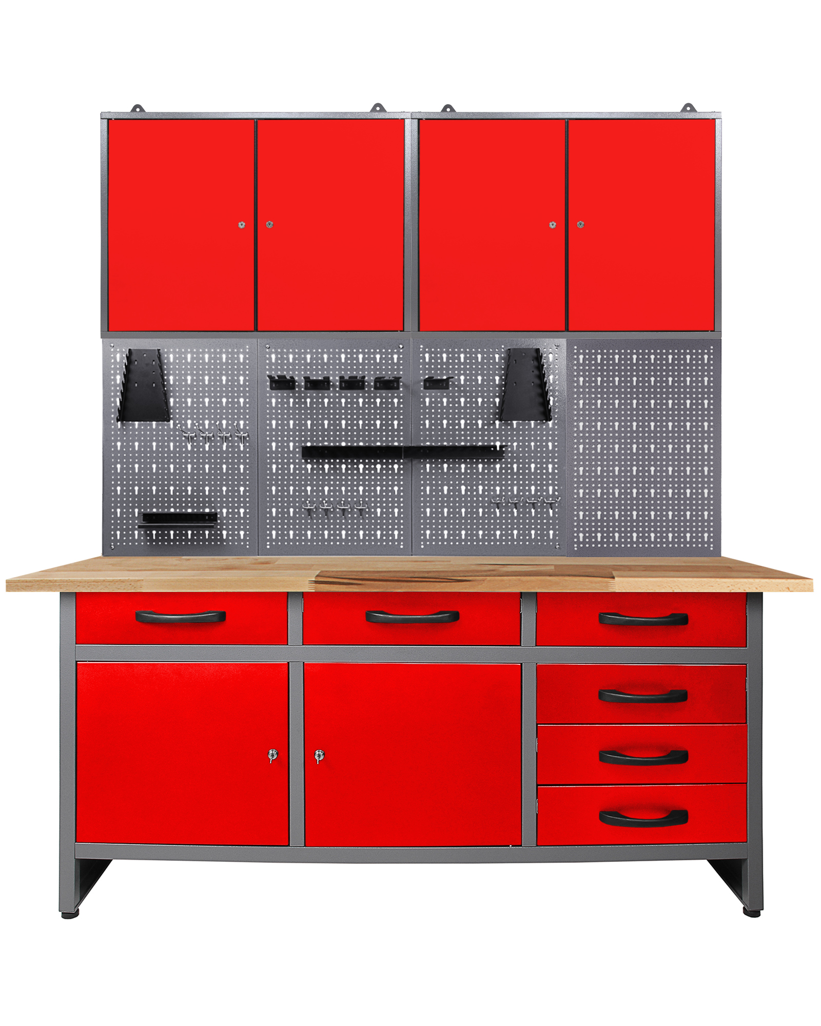 Werkstatteinrichtung 160 cm - Arbeitshöhe 85 cm - bestehend aus 1 x Werkbank (Karsten), 2 x Werkstattschrank (80 cm), 4 x Lochwand, 1 x Lochwandhaken-Set