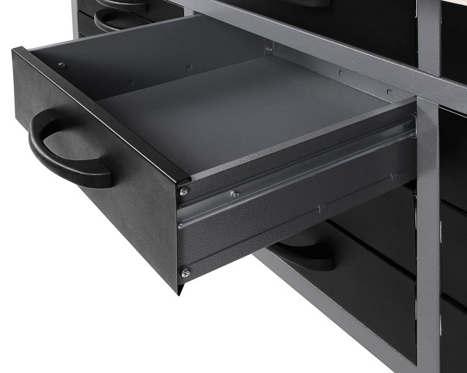 Die Werkbank Konny besitzt die Maße von ca. 160 x 60 x 85 (H) cm und überzeugt mit einer stabilen 160 cm langen Holzplatte. Diese weist eine Stärke von 28 mm auf und ist aus hochwertigem Buchenholz verleimt - dadurch ist sie top-solide! Unter der Holzplatte befinden sich 15 Schubladen (je ca. 43 x 43 x 13 (H) cm), die jeweils bis zu 20 kg belastbar sind. Dadurch können Sie jegliches Werkzeug und Werkstattzubehör sicher verstauen. Mithilfe von kugelgelagerten Schienen lassen sich die Führungsschienen unkompliziert schieben. Höhenverstellbare Füße sorgen für einen stabilen Stand sowie für ein bequemes Arbeiten. Der Metallkorpus ist neben einem modernen Design auch durch seine Resistenz gegen Kratzern und Feuchtigkeit charakterisiert.