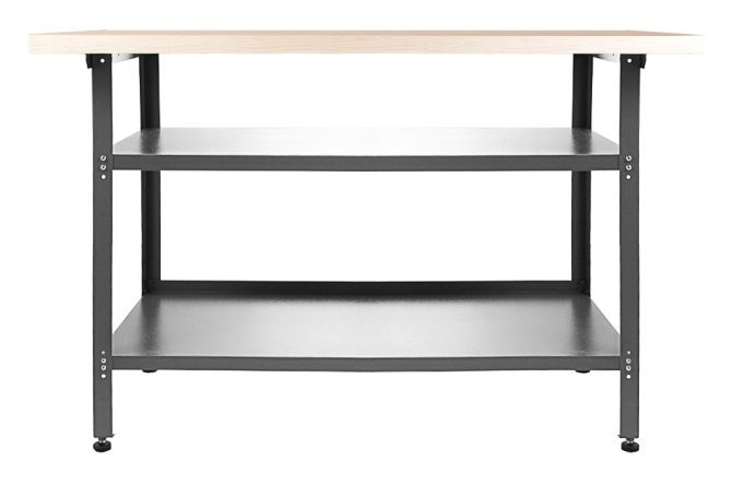 Die Werkbank Nobbi mit den Maßen von ca. 120 x 60 x 85 (H) cm besitzt eine äußerst starke 32mm Holzplatte, ummantelt von einer Schicht Melaminharz. Die zwei großen Arbeitsflächen sind jeweils bis 80 kg belastbar und dienen zur Ablage für Werkzeuge wie Bohrmaschine und Fräser. Die zwei Zwischenböden sind jeweils ca. 100 x 50 cm groß und verleihen dem Werktisch nicht nur mehr Stabilität. Sondern bietet auch jede Menge Stauraum. Höhenverstellbare Füße sorgen für einen stabilen Stand sowie für ein bequemes Arbeiten auf der Werkbank Nobbi. Der Metallkorpus ist neben einem modernen Design auch durch seine Resistenz gegen Kratzern und Feuchtigkeit charakterisiert.
