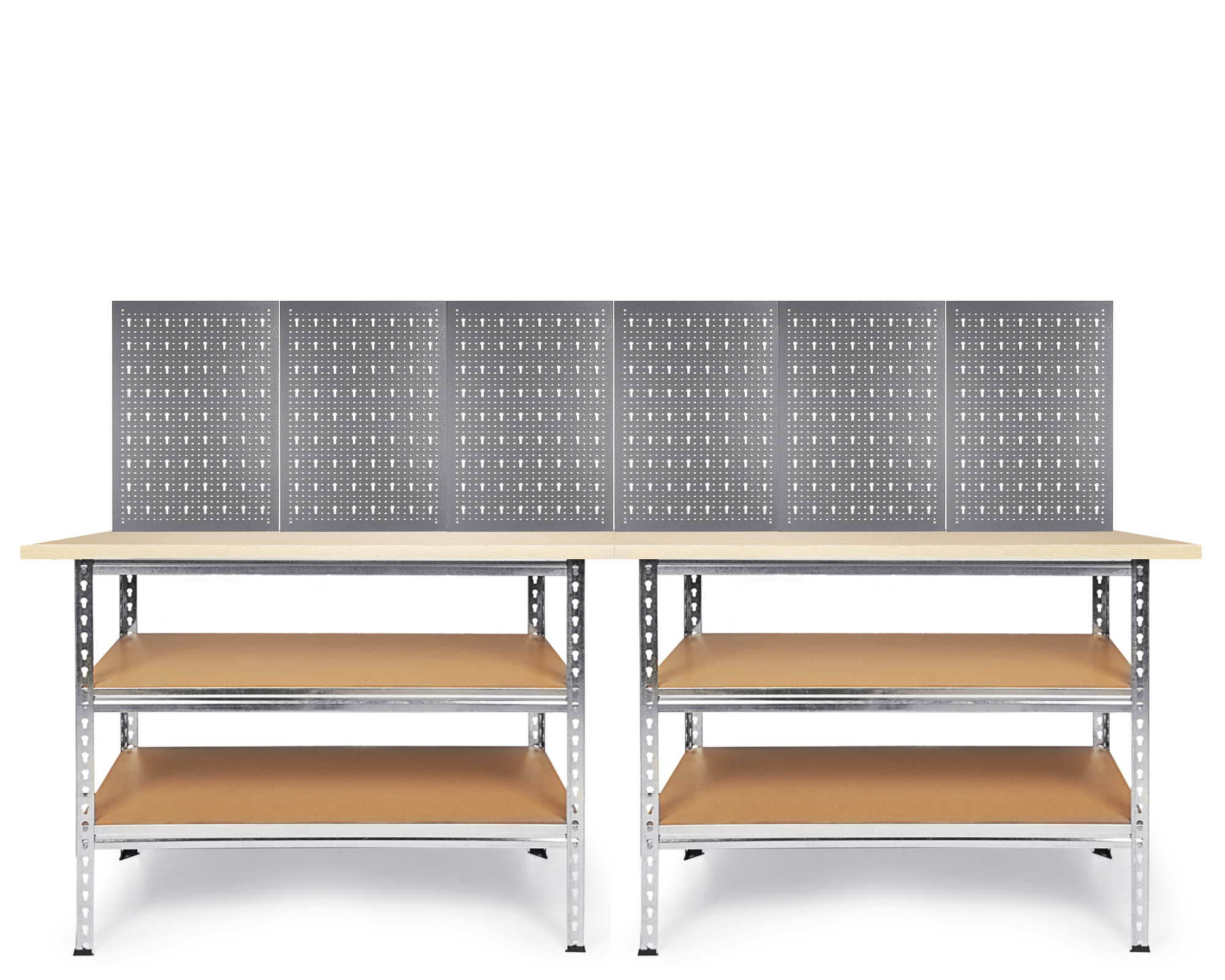 Werkstatteinrichtung 240 cm Uwe - Arbeitshöhe 92cm - bestehend aus 2 x Werkbank (Uwe), 6 x Lochwand, Die Werkbank Uwe besitzt eine stabile 120 cm lange Holzplatte, welche mit einer Melaminbeschichtung überzogen wurde und eine Stärke von 25 mm aufweist - dadurch ist sie top-solide!