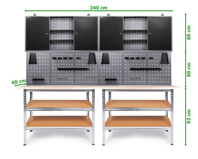 Werkstatteinrichtung 240 cm Uwe - Arbeitshöhe 92cm - bestehend aus 2 x Werkbank (Uwe), 2 x Werkstattschrank (120 cm), 6 x Lochwand, 2 x Lochwandhaken-Set