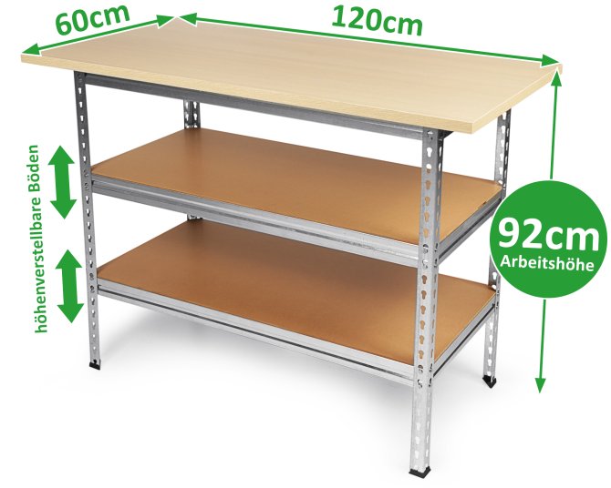 Insgesamt hat der Handwerktisch die Maße von ca. 120 x 60 x 92 (H) cm. Um für besondere Stabilität und Langlebigkeit zu sorgen, wurde der Packtisch aus Metall gefertigt und verzinkt. Dadurch ist der Werktisch auch vor Korrosion und Feuchtigkeit geschützt.