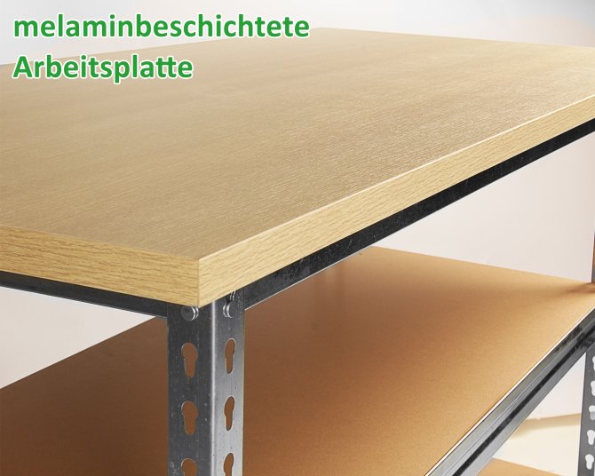 Die Werkbank Uwe besitzt eine stabile 120 cm lange Holzplatte, welche mit einer Melaminbeschichtung überzogen wurde und eine Stärke von 25 mm aufweist - dadurch ist sie top-solide!