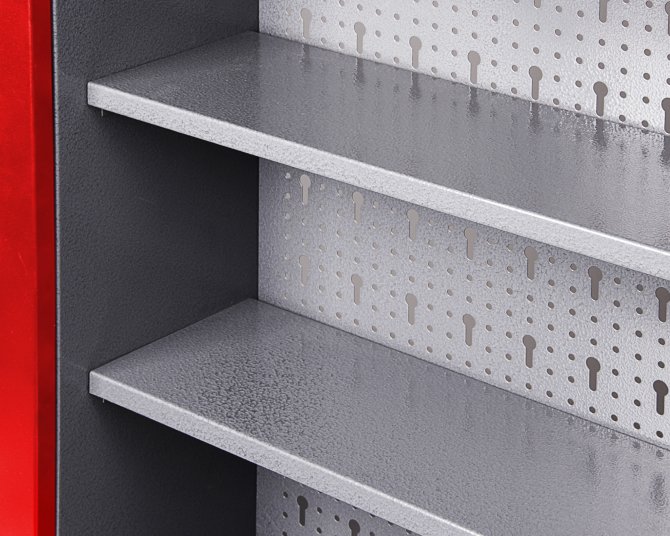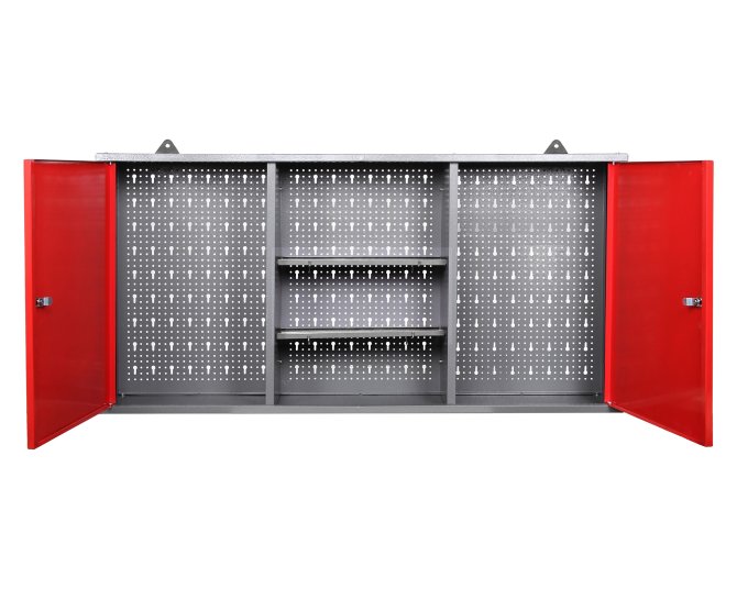 Der Werkzeugschrank Kurt besitzt die Maße von ca. 120 x 19 x 60 (H) cm und wiegt nur erstaunliche 10 kg. Der Schrank besteht aus drei Elementen (insgesamt 120 cm): Zwei großen verschließbaren Schrankteilen und einem offenen Abteil (je ca. 40 x 16 x 58 (H) cm). An der dazugehörigen Euro-Lochwand lassen sich Haken platzieren, um Werkzeuge oder weiteres Zubehör einzuhängen. Der Werkzeugschrank ist durch die großen stabilen Aufhängungen leicht und sicher an der Wand zu befestigen.
