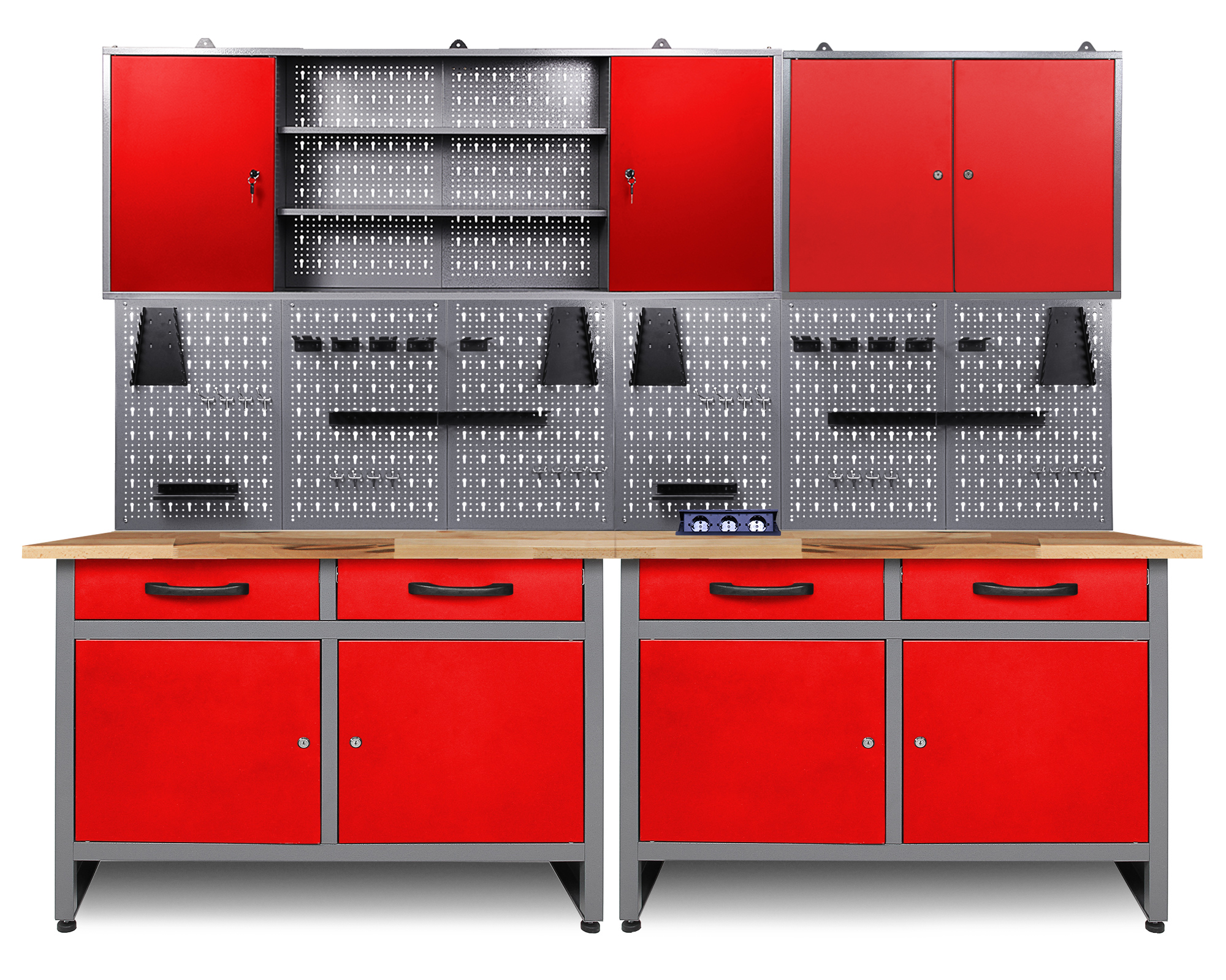 Werkstatteinrichtung 240 cm - Arbeitshöhe 85 cm - bestehend aus 2 x Werkbank (Werner), 2 x Werkstattschrank (120 cm), 6 x Lochwand, 2 x Lochwandhaken-Set