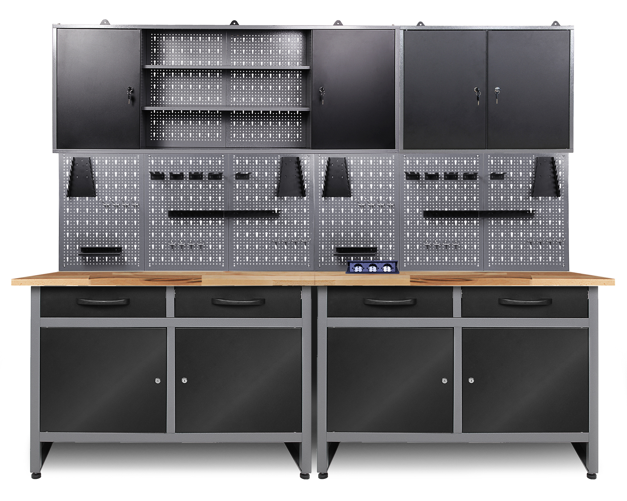 Werkstatteinrichtung 240 cm - Arbeitshöhe 85 cm - bestehend aus 2 x Werkbank (Werner), 2 x Werkstattschrank (120 cm), 6 x Lochwand, 2 x Lochwandhaken-Set