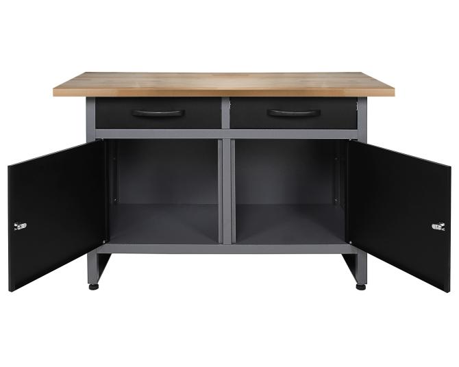 Die Werkbank Werner besitzt die Maße von ca. 120 x 60 x 85 (H) cm und weist eine äußerst starke 28 mm Holzplatte auf. Sie ist aus hochwertigem Buchenholz verleimt und dadurch ist sie top-solide! Die Werkbank Werner verfügt aus zwei verschiedenen Elementen. Zum einen aus zwei großräumigen Schubladen, zum anderen zwei verschließbare Schrankteile. Mithilfe dieser Stauraumfächer lassen sich Werkzeug und Werkstattzubehör sicher und einfach verstauen. Höhenverstellbare Füße sorgen für einen stabilen Stand sowie für ein bequemes Arbeiten auf der Werkbank Werner. Der Metallkorpus ist neben einem modernen Design auch durch seine Resistenz gegen Kratzern und Feuchtigkeit charakterisiert.