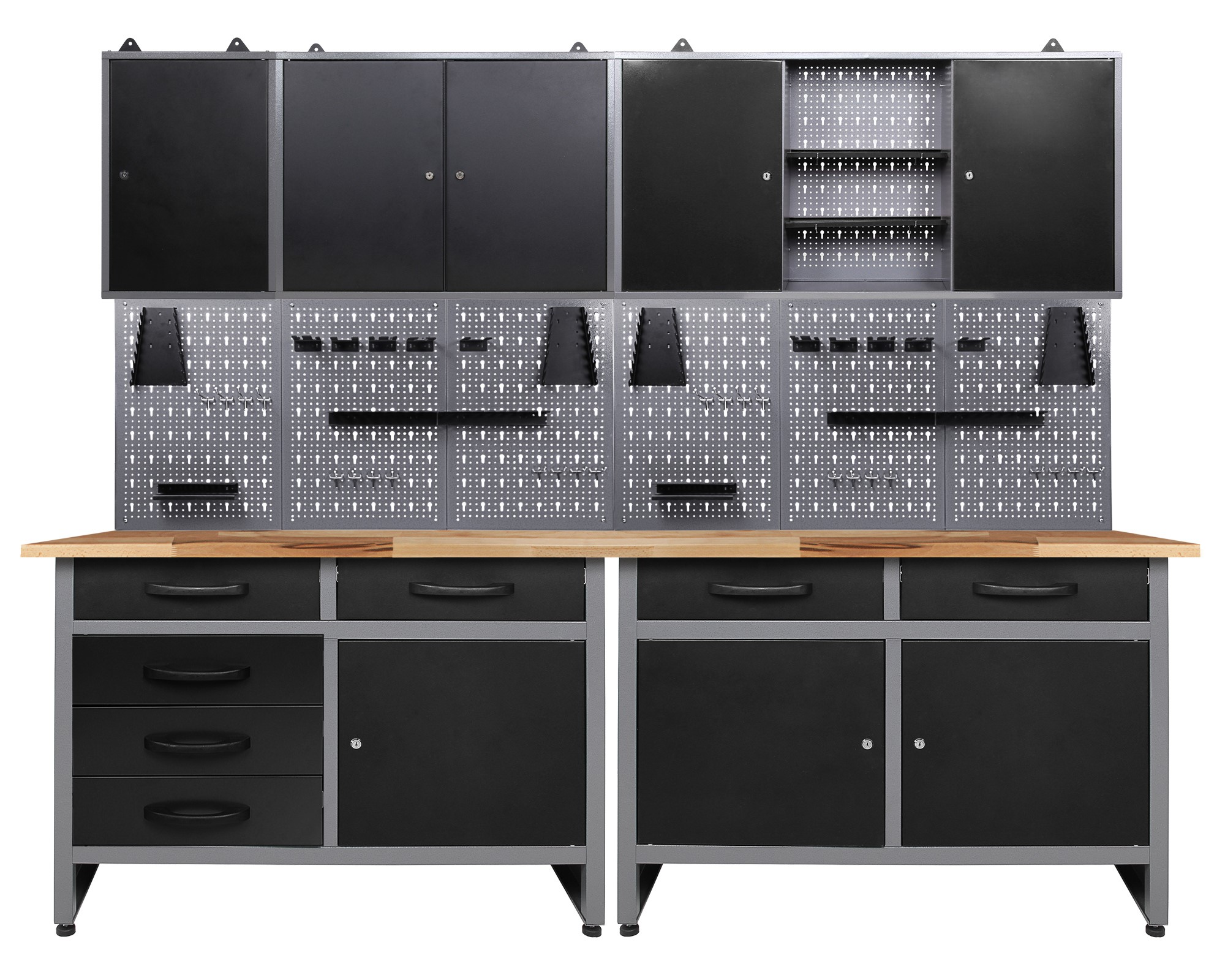 Werkstatteinrichtung 240 cm - Arbeitshöhe 85 cm - bestehend aus Werkbank Werner und Werkbank Holger, 3 x Werkstattschrank (42 cm / 80 cm / 120 cm), 6 x Lochwand, 2 x Lochwandhaken-Set