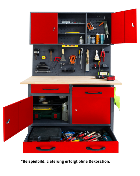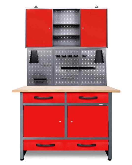 Werkstatteinrichtung 120 cm - Arbeitshöhe 95 cm - bestehend aus 1 x Werkbank (Werner Plus), 1 x Werkstattschrank (120 cm), 3 x Lochwand, 1 x Lochwandhaken-Set
