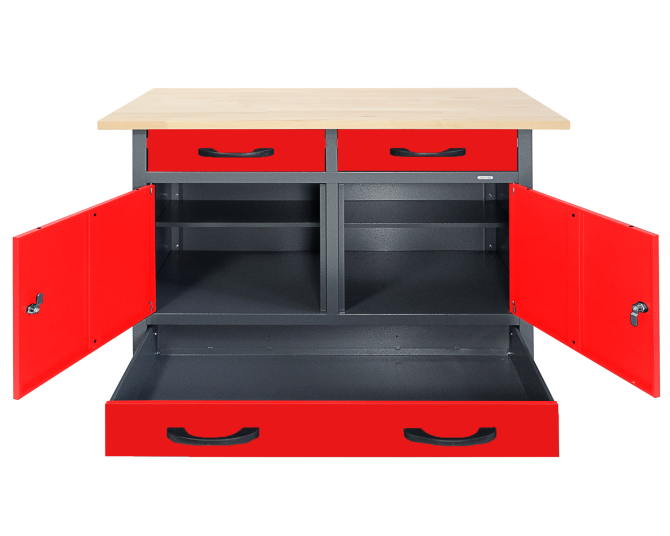 Die Werkbank Werner Plus besitzt die Maße von ca. 120 x 60 x 95 (H) cm und weist eine äußerst starke 28 mm Holzplatte auf. Sie ist aus hochwertigem Buchenholz verleimt und dadurch ist sie top-solide! Die Werkbank Werner verfügt aus zwei verschiedenen Elementen. Zum einen aus drei großräumigen Schubladen, zum anderen zwei verschließbare Schrankteile. Mithilfe dieser Stauraumfächer lassen sich Werkzeug und Werkstattzubehör sicher und einfach verstauen. Höhenverstellbare Füße sorgen für einen stabilen Stand sowie für ein bequemes Arbeiten auf der Werkbank Werner. Der Metallkorpus ist neben einem modernen Design auch durch seine Resistenz gegen Kratzern und Feuchtigkeit charakterisiert.