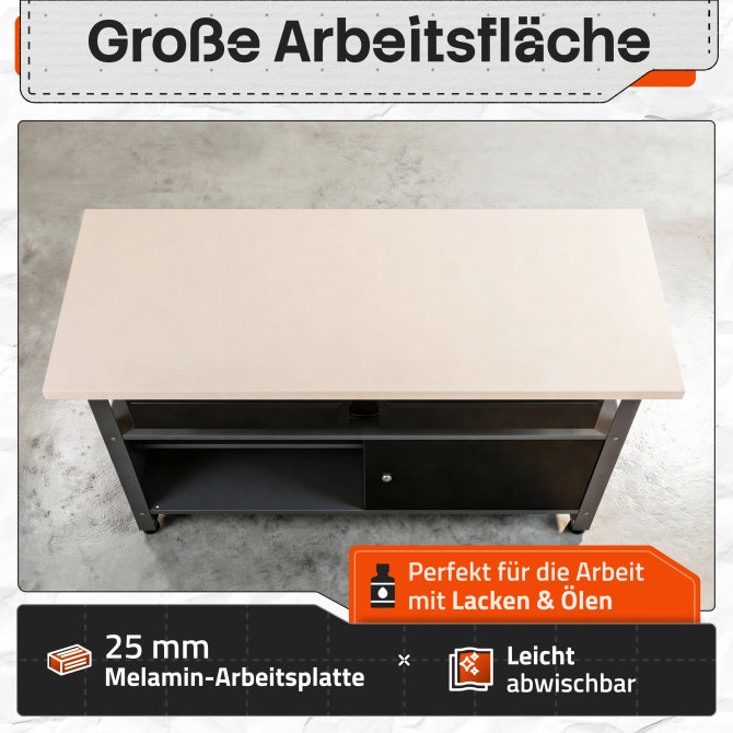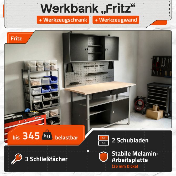 WERKBANK FRITZ - Herzstück der Werkstatteinrichtung bildet die Werkbank Fritz. Der Werktisch misst 120 x 60 x 85(H) cm verfügt über zwei einfache Schubladen, ein offenes Ablagefach für schnellen Zugriff und eine Tür. Das Türfach ist abschließbar, sodass deine Werkzeuge sicher verschlossen werden können. Die Arbeitsplatte ist melaminbeschichtet und 25mm stark. Sie lässt sich deshalb einfach reinigen und ist perfekt für Arbeiten mit Farbe oder Ölen geeignet. Die höhenverstellbaren Füße sorgen auch auf unebenen Flächen für den perfekten Stand.