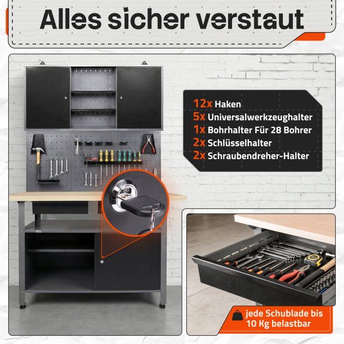 WERKZEUGWAND OLAF - Für den Platz direkt über der Arbeitsfläche sind insgesamt 3 Lochwandelemente mit 22 teiligem Hakensortiment vorgesehen. An den Lochwandhaken und Werkzeughaltern kannst du die Utensilien sortieren, auf die du jederzeit schnellen Zugriff beim Arbeiten benötigst, auch wenn du vielleicht mal nur eine Hand frei hast. Perfekt für Schraubenzieher, Maulschlüssel, Bohrer, Zangen, Pinsel, Spachtel, Messmittel und andere Werkzeuge.