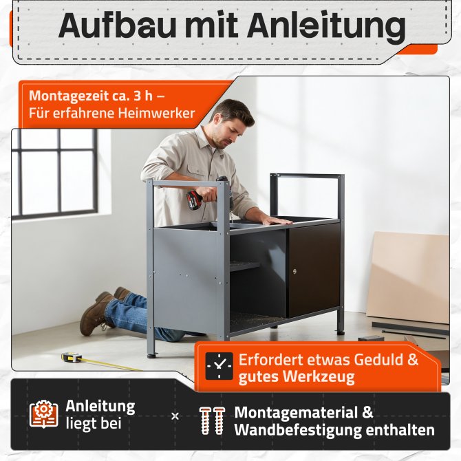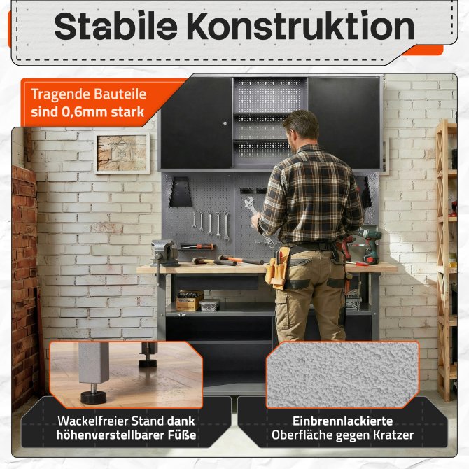 MAXIMALER STAURAUM - Insgesamt benötigst du ca. 120 (B) x 205 (H) x 60 (T) cm Platz am Aufstellort. Mit den höhenverstellbaren Füßen lässt sich noch etwas in der Höhe justieren. Generell kannst du die einzelnen Teile der Muster Werkstattlösung frei nach deinen Wünschen platzieren, wenn du zum Beispiel schon eine Lochwand oder einen Hängeschrank hast oder du an mehreren Orten Stauraum schaffen willst - dein Bedarf, deine Lösung!