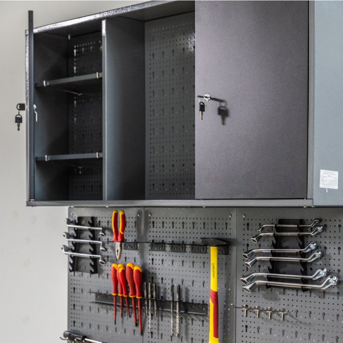 HÄNGESCHRANK KURT - Ganz oben findest du unseren absoluten Topseller und Klassiker Kurt. Der Werkstattschrank bietet mit zwei Türen und zwei Einlegeböden noch einmal extra Stauraum, der sonst in der Höhe verschenkt wäre. Dabei ist Kurt mit seinen 19cm Tiefe aber nicht beim Arbeiten im Weg. Gleichzeitig sind je zwei abschließbare Türen verbaut. Die Rückwände sind für maximale Flexibilität mit dem Hakensortiment der OLAF WERKZEUGWAND kompatibel.