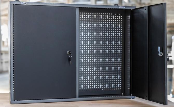 HÄNGESCHRÄNKE - Ganz oben findest du zwei unserer Hängeschränke Ben (80cm) und Tim (40cm). Der Schränke bietet mit einer bzw. zwei Türen und zwei Einlegeböden noch einmal extra Stauraum, der sonst in der Höhe verschenkt wäre. Dabei sind sie mit ihren 19cm Tiefe aber nicht beim Arbeiten im Weg. Gleichzeitig sind abschließbare Türen verbaut. Die Rückwände sind für maximale Flexibilität mit dem Hakensortiment der OLAF WERKZEUGWAND kompatibel.