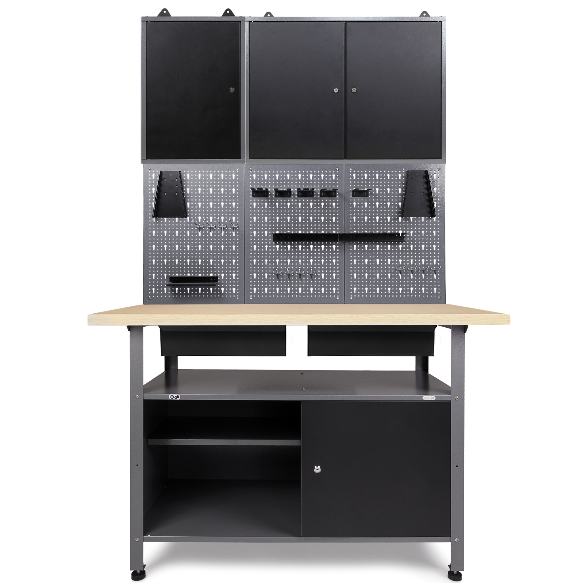 MAXIMALER STAURAUM - Insgesamt benötigst du ca. 240 (B) x 205 (H) x 60 (T) cm Platz am Aufstellort. Mit den höhenverstellbaren Füßen lässt sich noch etwas in der Höhe justieren. Generell kannst du die einzelnen Teile der Muster Werkstattlösung frei nach deinen Wünschen platzieren, wenn du zum Beispiel schon eine Lochwand oder einen Hängeschrank hast oder du an mehreren Orten Stauraum schaffen willst - dein Bedarf, deine Lösung!