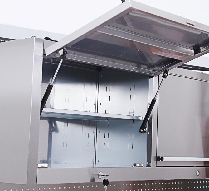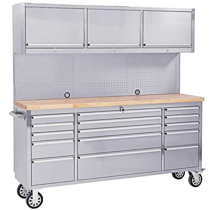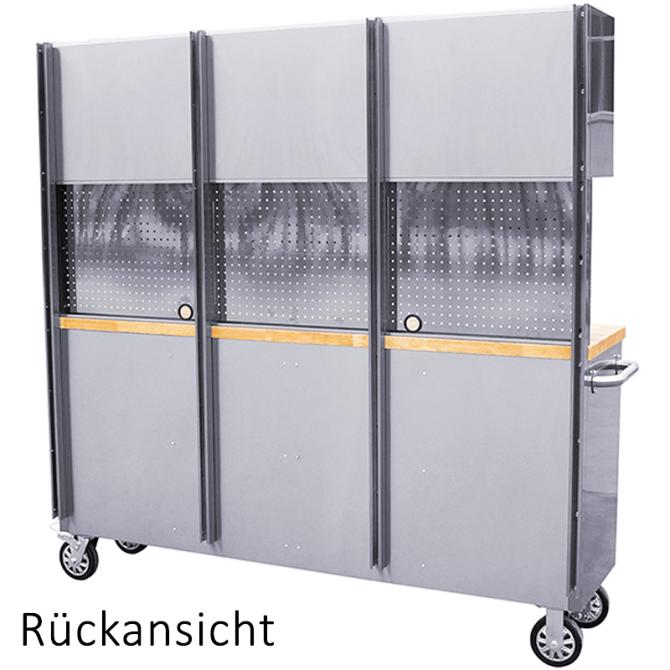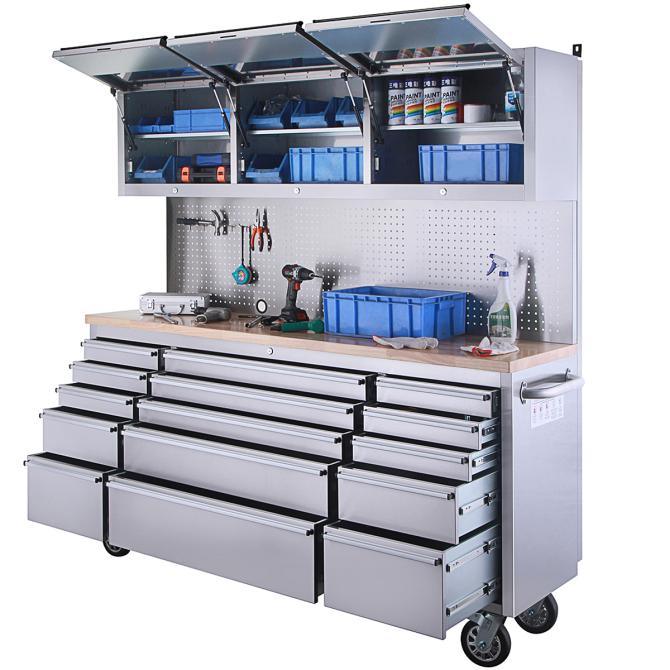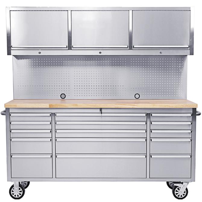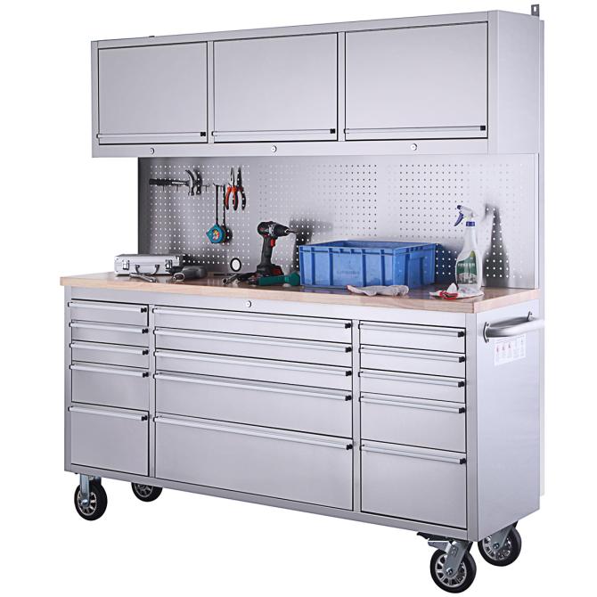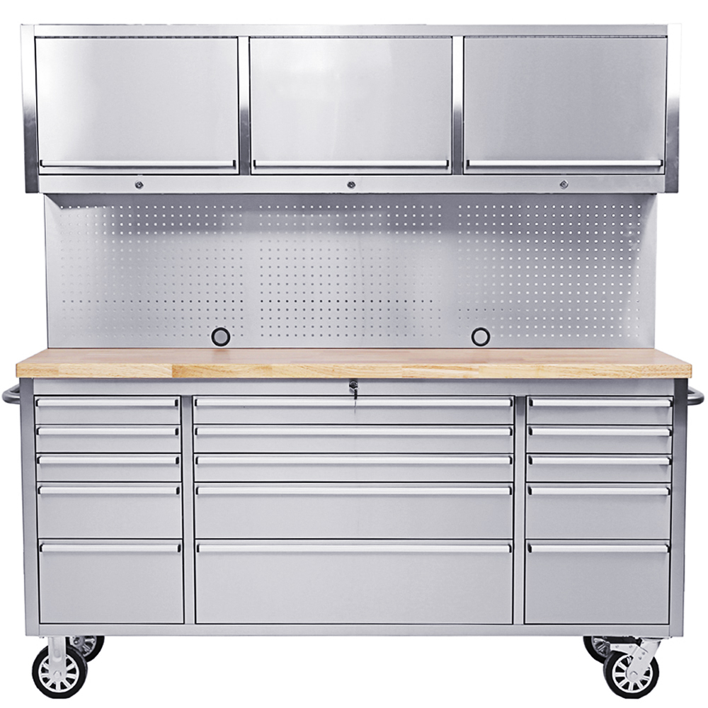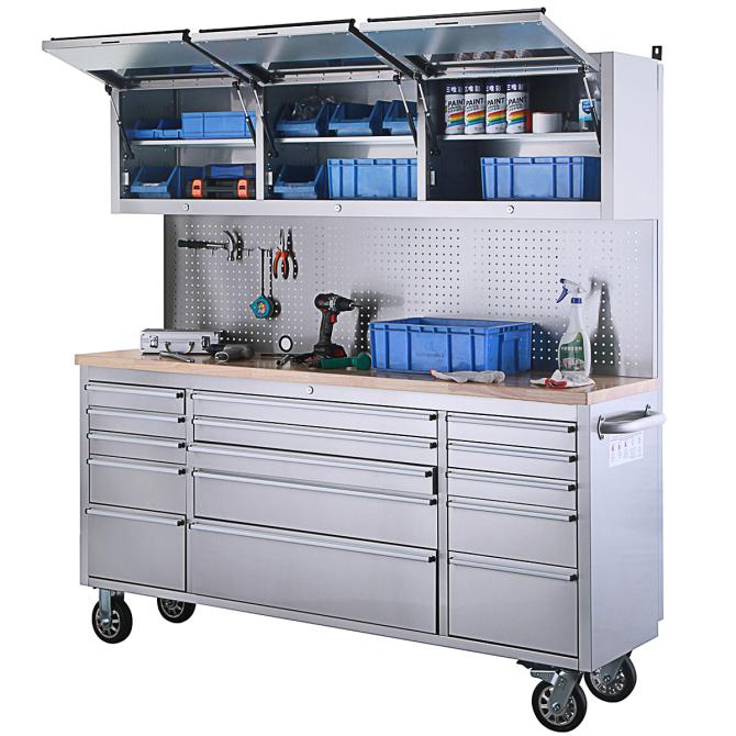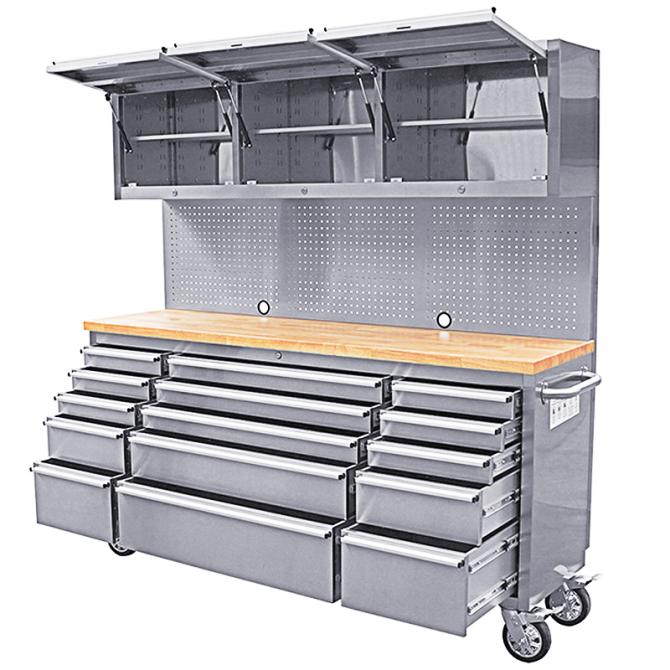 Die Lochwand aus rostfreiem Stahl ermöglicht die praktische Aufbewahrung von Werkzeugen und erleichtert den Zugang zu häufig verwendeten Gegenständen. Darüber hinaus sorgen 3 Hängeschränke für zusätzlichen Stauraum und organisatorische Vielfalt.