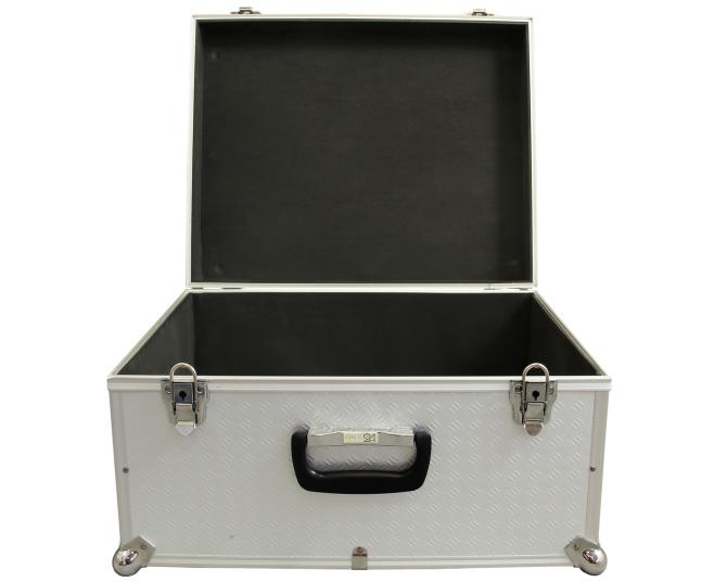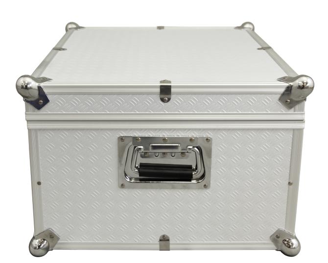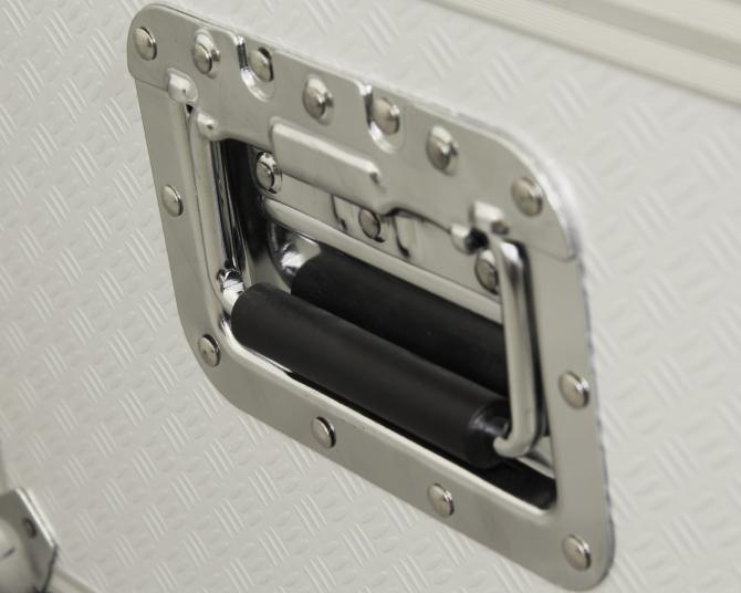 Es handelt sich hier keinesfalls um eines der üblichen, schlichten Kellermodelle. Dank dem überzeugenden Design und der sehr guten Verarbeitung kann man sich mit diesem Koffer sehen lassen. Dazu lässt sich dieses Modell optimal transportieren. Mithilfe der beiden seitlich angebrachten Griffe aus Metall ist das Tragen zu zweit oder auch allein hervorragend möglich. Zusätzlichen Tragekomfort bietet die Kunststoffummantelung, sodass auch schwerere Ladungen keine unangenehmen Kerben in den Handflächen hinterlassen. Die seitlichen Tragegriffe sind federgelagert und bringen sich somit selbständig zurück in Ausgangsposition, wenn Sie diese loslassen. Aber auch der Frontgriff aus Kunststoff ist überaus praktisch zum Tragen, oder wenn Sie die Box einfach aus einem Regal oder Schrank ziehen möchten.