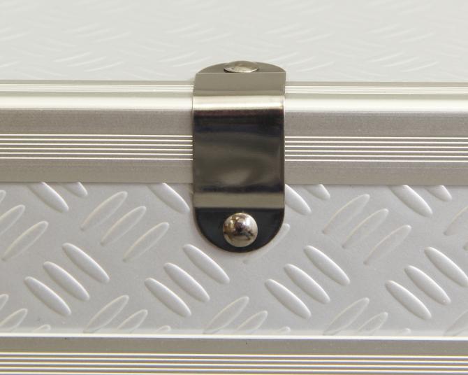 Der Transportkoffer Aufbewahrungskoffer in eleganter, silberner Aluminium / Riffelblech-Optik hat einen dreischichtigen Aufbau mit einem Aluminiumrahmen sowie stabilen Eckbeschlägen für ein besonderes Maß an Stabilität und Sicherheit. Dieses dreischichtige System weisen viele gute Aluoptik-Koffer auf. Der Koffer ist in drei Größen (L/M/S) erhältlich. Mit seiner edel, matten Riffelblech-Optik sowie den silbernen, abgerundeten Hochglanzbeschlägen an den Ecken ist er für die unterschiedlichsten Einsatzbereiche geeignet. Diese stabile Konstruktion sorgt für ein hohes Maß an Sicherheit für die in dem Koffer aufbewahrten Gegenstände. Die Innenauskleidung ist aus robustem Neopren gefertigt, was das Transportgut zuverlässig vor Beschädigungen und Stößen schützt. Dieses Material sieht zudem auch noch gut aus und macht einen optisch einwandfreien Eindruck. Die darunter liegende Holzschicht ist mit einer Kunststoffumkleidung in silberner Riffelblechoptik bedeckt, welche dem Koffer sein edles Äußeres verleiht. Diese moderne Verkleidung ist kratzfest und robust und sieht darüber hinaus sehr attraktiv aus. Die Ecken des Aufbewahrungskoffers weisen abgerundete hochglänzende silberne Schutzecken auf, wodurch Verletzungen verhindert werden und auch etwaige Gegenstände in der Umgebung des Transportkoffers nicht so leicht beschädigt werden können. Diese extra robust gefertigten und weit ausladenden Eckbeschläge sorgen außerdem dafür, dass man diesen Koffer beispielsweise auf Teppich kinderleicht verschieben kann. Außerdem wird somit Abstand zum Boden aufgebaut, was die Oberfläche des Koffers schont und eine Zyrkulation der Luft unter dem Koffer begünstigt. So bildet sich keine Staunässe unter der Box, auch wenn sie mal länger an einem Ort steht. Der Deckel des Koffers lässt sich weit öffnen, sodass auch größere Gegenstände komfortabel verstaut werden können. Desweiteren verfügt diese Transportbox über einen raffiniert konzipierten Deckelanschlag der sicherstellt, dass der Deckel zu weit aufgeklappt wird und Schaden nimmt oder gar abbricht.
