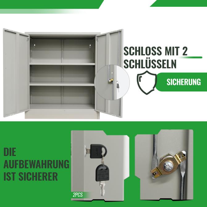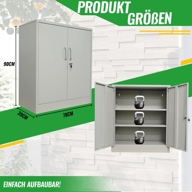 Dieser Stahlschrank hat die Maßen von ca. 78 x 39 x 170 (H) cm und verfügt über vier Einlageböden aus Metall, die einfach und schnell in den Seitenwänden befestigt werden. Die Einlegeböden sind in der Höhe verstellbar und können jeweils bis zu 50 kg tragen. So können Sie die Einlegeböden auch solchen Abständen anbringen, der Ihnen insbesondere die Aufbewahrung von Ordnern in mehreren Reihen übereinander ermöglicht. Der Weg für ein Archiv ist damit frei. Die beiden Türen des Schranks sind einfach abzuschließen (2 Schlüssel im Paket enthalten). Der Aktenschrank ist damit die ideale Ergänzung für Ihr Büro. Er ist noch ausreichend leicht, sodass er bei Bedarf auch verrückt oder zu zweit umhergetragen werden kann.