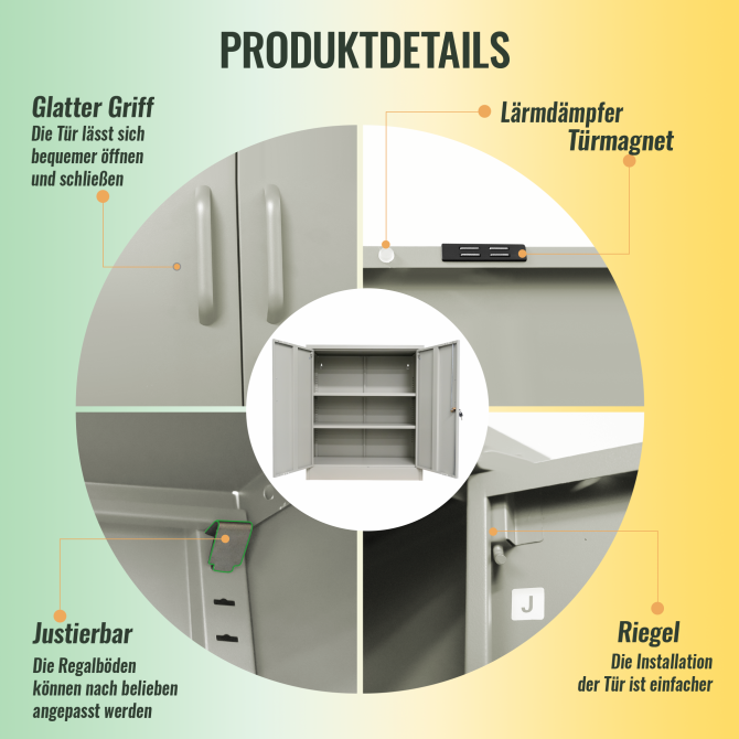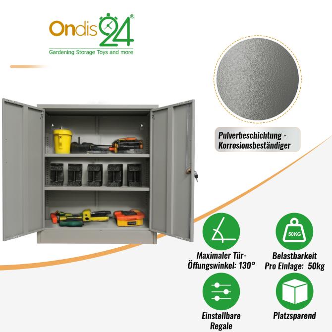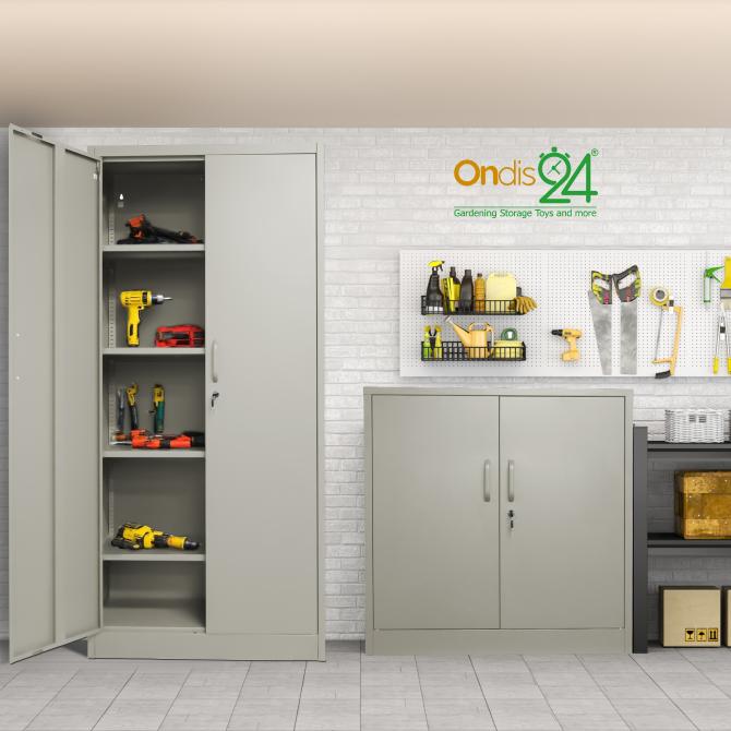 In der Werkstatt oder im Garten vermag der Metallschrank Ihnen ebenfalls große Dienste erweisen. Die Metallböden sind sehr stabil. Schwere, große Werkzeuge können Sie hier einfach und sicher lagern. Wenn Sie den Schrank in Lagern oder Industrie-Betrieben aufstellen, finden (Halb-)Fertigteile oder Maschinen hier eine robuste Zwischenstation. Dieser Werkzeugschrank ist daher äußerst vielseitig einsetzbar.