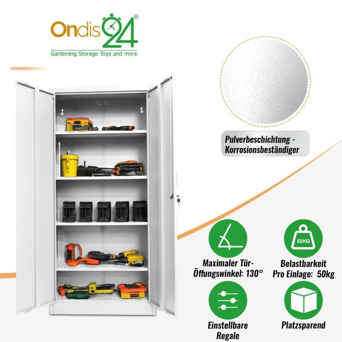 In der Werkstatt oder im Garten vermag der Metallschrank Ihnen ebenfalls große Dienste erweisen. Die Metallböden sind sehr stabil. Schwere, große Werkzeuge können Sie hier einfach und sicher lagern. Wenn Sie den Schrank in Lagern oder Industrie-Betrieben aufstellen, finden (Halb-)Fertigteile oder Maschinen hier eine robuste Zwischenstation. Dieser Werkzeugschrank ist daher äußerst vielseitig einsetzbar.