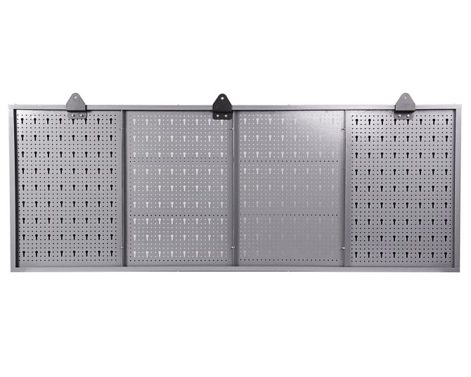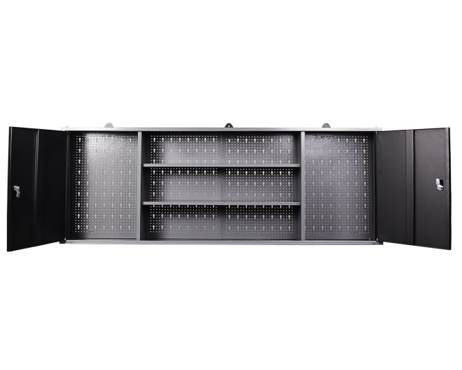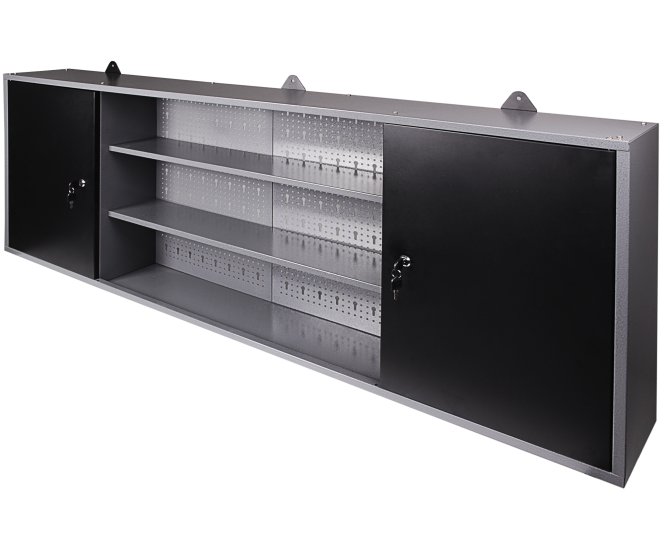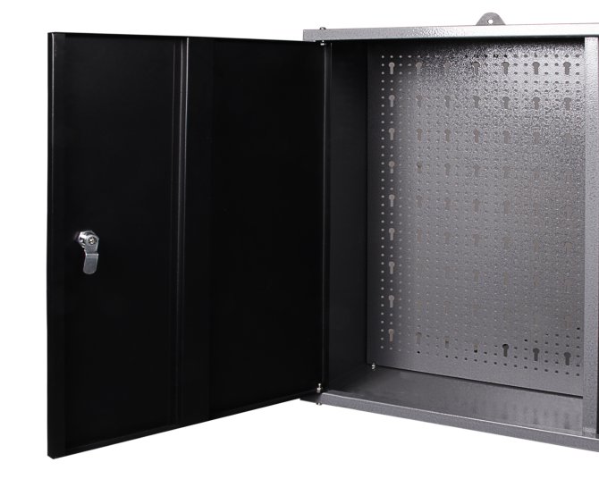 Der Schrank besteht aus drei Elementen: einem offenen Mittelteil und zwei verschließbaren Abteilen. Die gesamte Rückwand des Schrankes besteht aus einer Eurolochwand. Wenn Sie daran Haken befestigen, können Sie bequem mehrere Werkzeuge und Zubehör über- und nebeneinander hängen.
