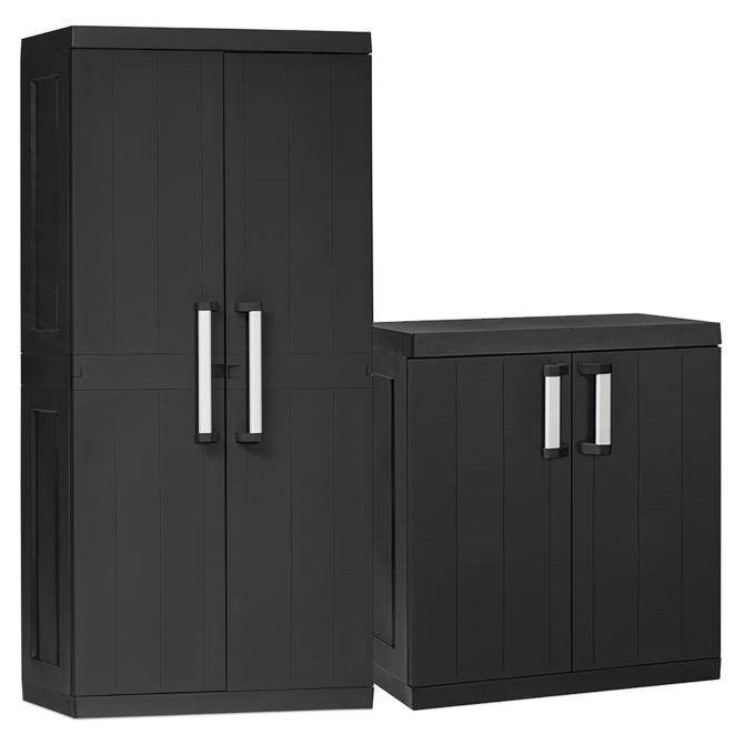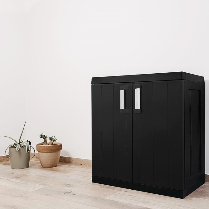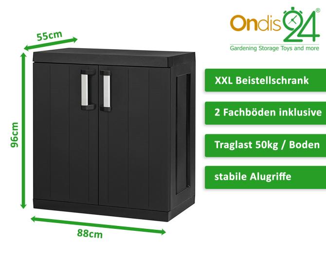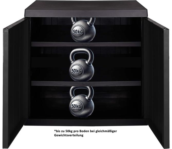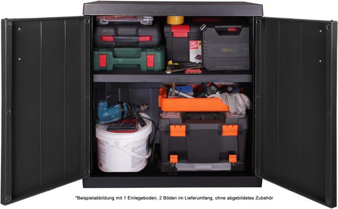 Der Kunststoffbeistellschrank Garage XL verfügt über zwei Einlegeboden, deren Höhe Sie selbst ganz einfach anpassen können. Für große Gegenstände können Sie den Boden schnell herausnehmen. Wenn Sie den Boden gleichmäßig verteilen, lassen sich Ordner perfekt darauf abstellen (Gesamtbelastbarkeit bis zu 50 kg/Boden). Ganz unten können Sie dann weitere Unterlagen verstauen. Selbstverständlich lassen sich genauso gut Schuhe, Putzmittel oder Pflegeutensilien für das geliebte Auto im Schrank lagern. Auch große Dinge lassen sich wegen der beiden weit aufschwingenden, mit einem Vorhängeschloß abschließbaren Türen mit robusten Aluminiumgriffen einfach verstauen, und erleichtern somit das Bestücken des Schrankes.