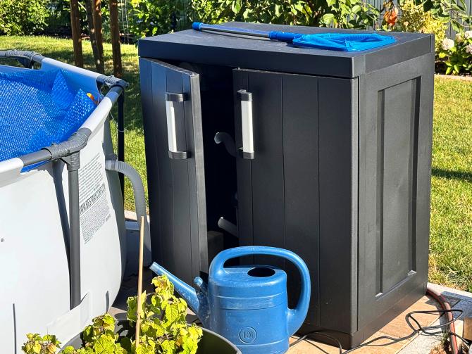 Insgesamt hat der Kunststoffschrank die Maße von ca. 88 x 54 x 96 (H) cm (innen ca. 79 x 46 x 93 (H) cm), womit er sehr geräumig ist. Der Kunststoff ist äußerst robust und lässt sich leicht reinigen. Am besten eignet sich hierfür einfaches Seifenwasser.